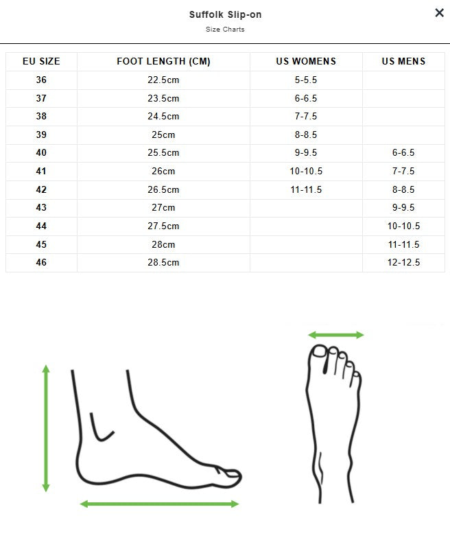 Women's sizing EU 37 - 40 are fairly true to size with Valais Slip-on being more generous fit. Please ensure you refer to the specific size meaurements on Valais size chart.